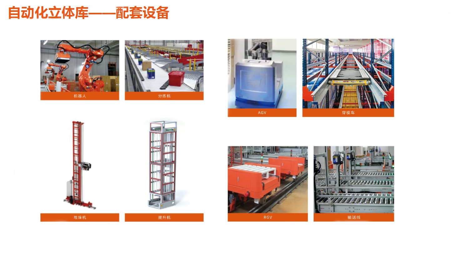 项目主要组成:高层货架、托盘(货箱)、巷道堆垛机、输送机系统、AGV系统、自动控制系统、库存信息管理系统。